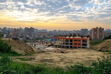 Urban construction site with cranes and partially built structures against city skyline in warm evening light. Concept of modern metropolitan expansion