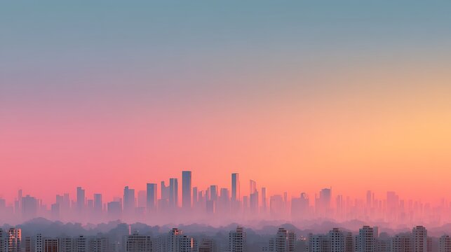 Minimalist futuristic urban skyline with pastel gradient horizon, clean silhouette of modern buildings, wide background template with empty space for text.