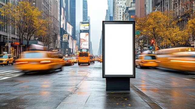 A blank bus stop advertising board on busy London street with space for copy, text or generative fill