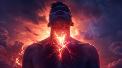 Dynamic portrait of a man with a fiery glow and energy radiating from his chest, symbolizing power and transformation.