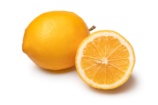 Whole and halved fresh Meyer lemon close up isolated  on white background