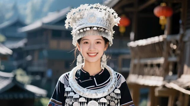 A smiling Miao girl in traditional ethnic attire, Guizhou, China.