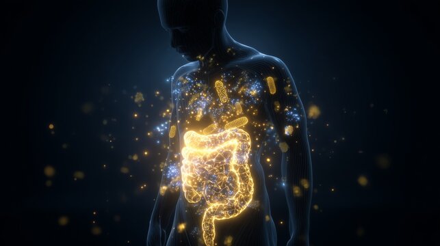 Human silhouette with illuminated gut highlights the role of gut bacteria in health and wellness