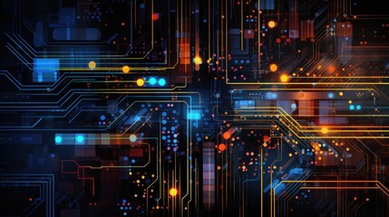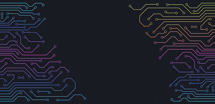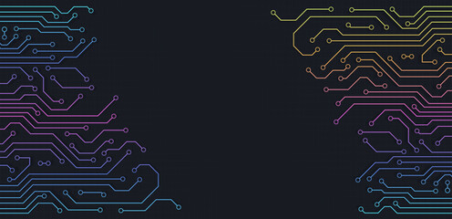 Flat colorful microelectronics circuit board banner isolated on a dark background. The geometric texture of digital technology, computer, motherboard, or high-tech technology. Vector illustration