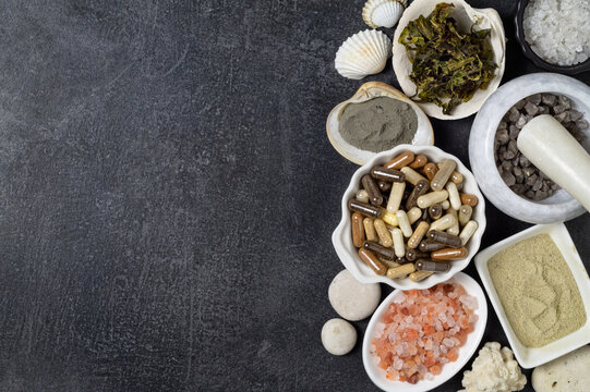 Dietary supplements in capsules, various crystals of salt, algae and sea minerals in plates and in mortar