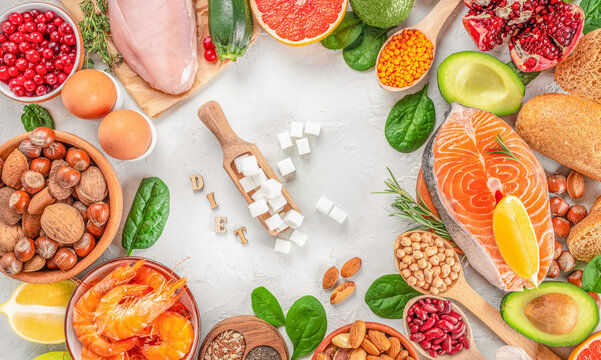 Food with foods high in vitamins, minerals, antioxidants, smart carbohydrates, Diabetic sugar free diet, top view