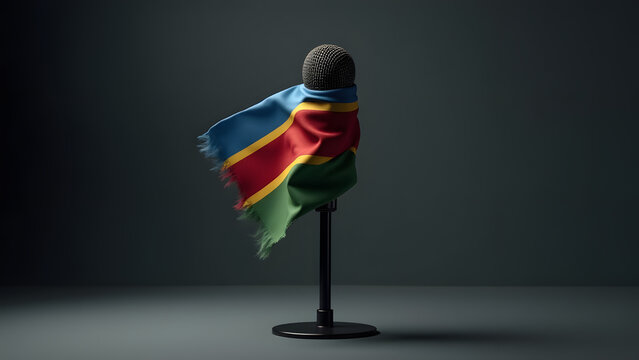 Slovakia’s flag binds a microphone, its fabric straining—a silent cry against suppression. Moody lighting heightens the visual tension.