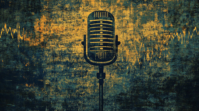 A dynamic and eclectic illustration with a microphone and a torn piece of paper with a musical note, a sound wave symbol and a speech bubble. A banner design template for a podcast or music project.