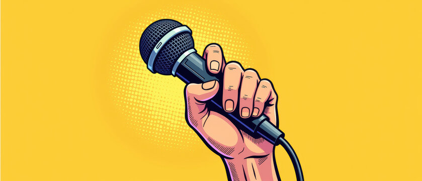 A hand holding a vintage red microphone is chained up, symbolizing the struggle for freedom of speech and expression
