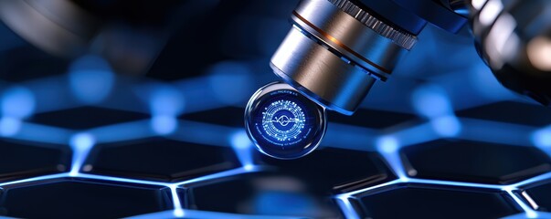A close-up view of a microscope lens focusing on a hexagonal pattern, illuminated by blue light, highlighting the intricate details of a scientific sample.