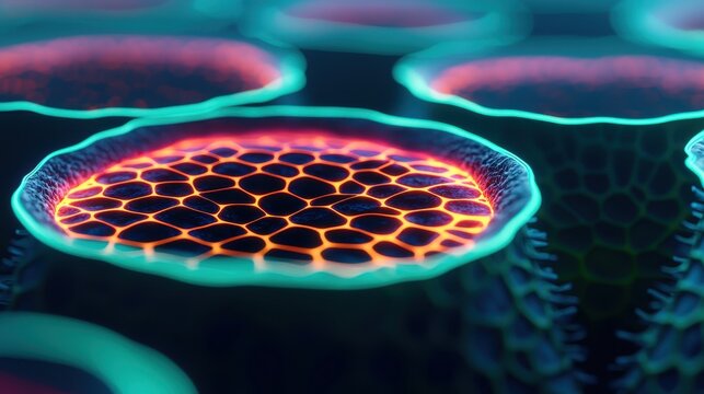 A vibrant, close-up view of cellular structures, showcasing hexagonal patterns and glowing edges, highlighting the intricate beauty of microscopic life.
