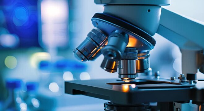 A microscope with a blue background and a blue bottle on the left side. The microscope is focused on a small object