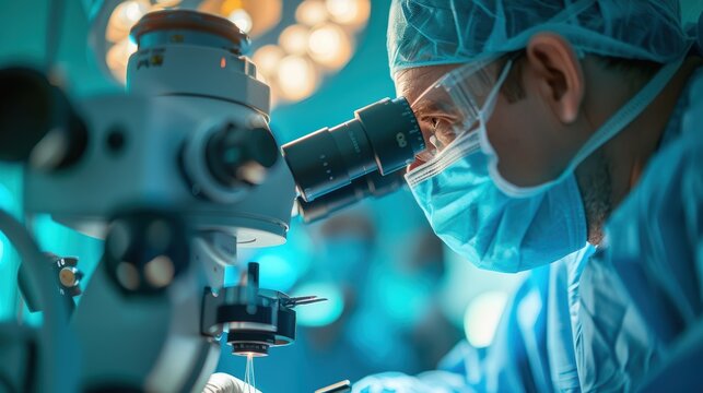 Surgeon performing microsurgery with medical microscope in operating room