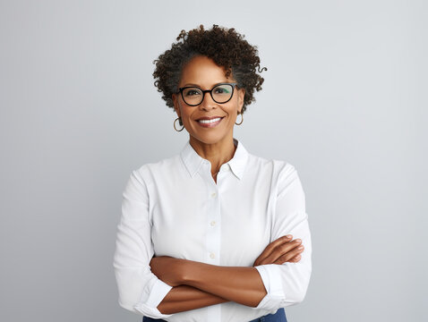Pro mid aged Latin business woman corporate leader smiles. Positive mature female executive manager stands in office arms crossed, looks at camera. Confident lady, success in business. Leadership.
