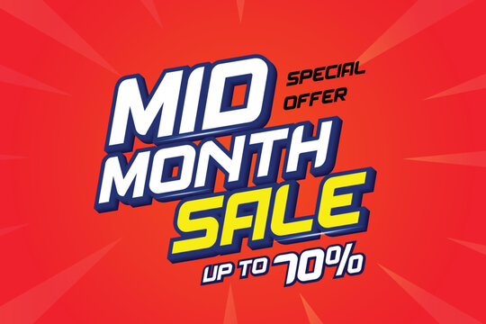 Mid month sale poster or banner vector template design. Big sale event on the red background. Ads for web, social media, shopping online.