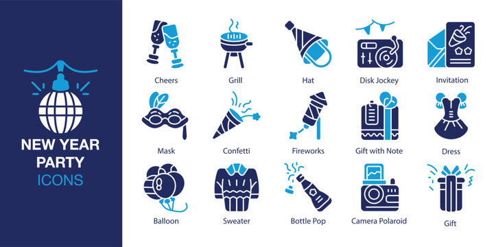 New Year Party icon set. Containing countdown, midnight, fireworks, champagne, toast and more. Solid vector icons collection. Vector illustration.