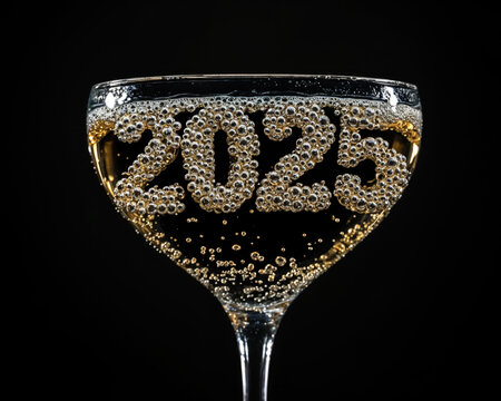 Champagne bubbles forming the number 2025 in a glass celebrating new year's eve