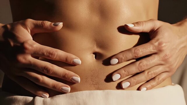 Close Up Of A Woman's Toned Midriff With Sparkling Skin And White Nail Polish Hands Gently Touching Her Stomach In Soft Lighting