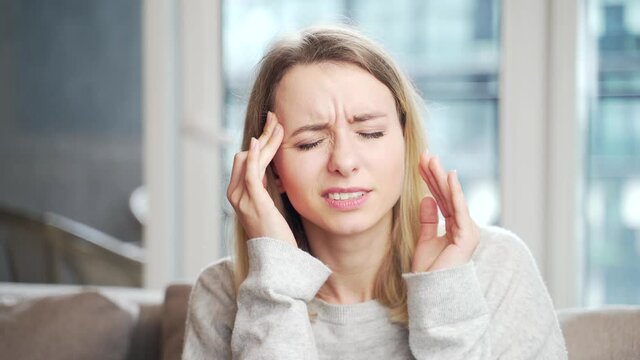 portrait a young woman sitting at home on the couch with a severe headache. Head spasms, headache. Female blonde holding her head. girl suffering from migraine or hangover at house in the living room