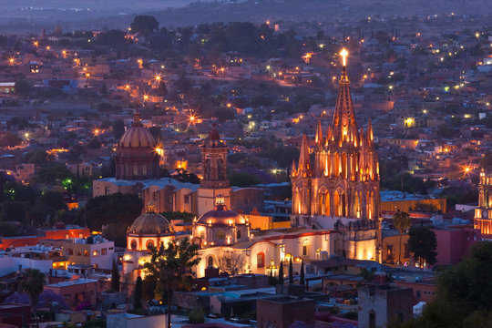 Mexico, San Miguel de Allende. La Parroquia de San Miguel Arcangel Church dominates the city at twilight.