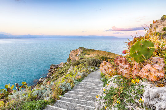 Milazzo, Sicily, Italy. Panorama of the city at sunset.	Sunset over the coast