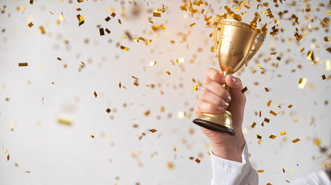 Dynamic image capturing the moment of triumph, with a hand raising a golden trophy amidst a shower of confetti, symbolizing victory and success with copy space.