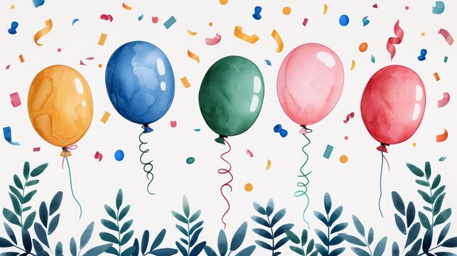 Celebration theme milestone digits, flat design from above, vibrant watercolor style with triadic colors, adorned with festive elements such as balloons and streamers