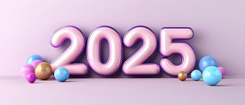 Neon 2025 sign with a soft glowing pink and blue hue delicate confetti dots sprinkled across a pastel lavender background creating a futuristic yet classy and elegant visual