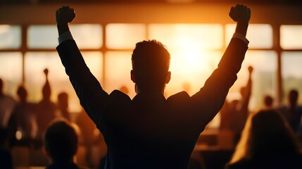 A powerful business leader standing in front of a successful team, arms raised in triumph, celebrating a major achievement in the corporate world