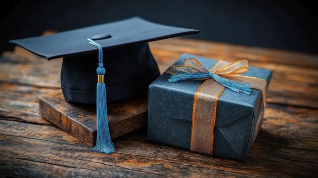 Celebrate success with festive graduation day banner, golden lettering against a navy backdrop with confetti and a graduation cap for a momentous occasion