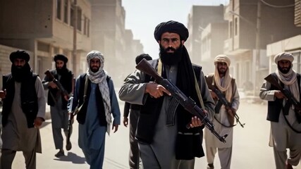 Armed militants with rifles walk through a destroyed city street during a military conflict, a concept for news reporting and geopolitical analysis