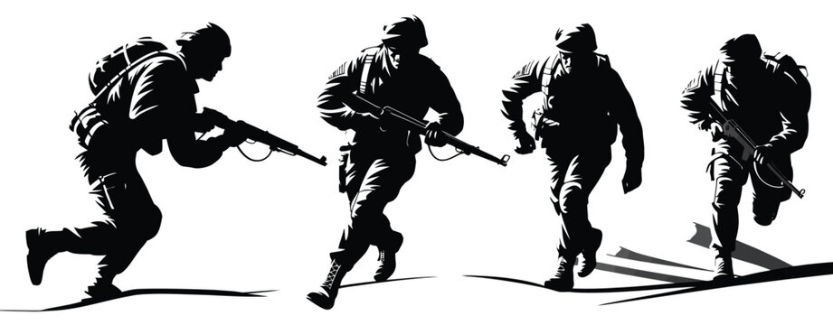 Armed Forces Silhouette Vector,  Soldier Running with Gun in Action Pose for Military Training, Combat, Security, and War-Themed Design Projects
