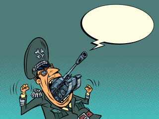 The tank comes out of the mouth of a military general. Militarism and the threat to peace