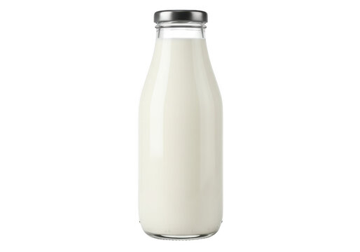 Clear glass bottle filled with creamy white milk and silver cap isolated on transparent background