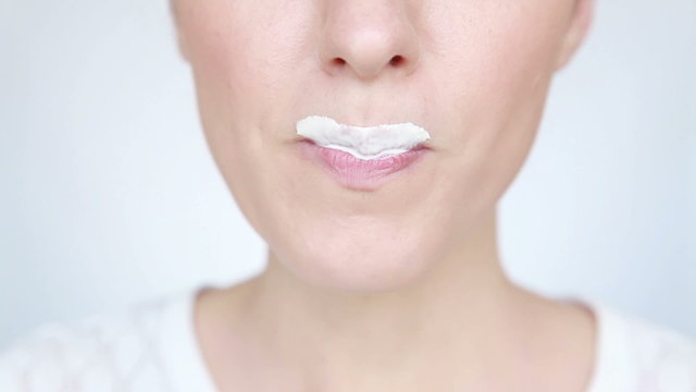 Woman drinking milk and licking white mustache