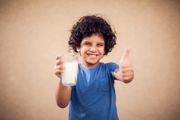Happy kid boy holds glass of milk and shows thumb up gesture. Children, healthcare and food concept