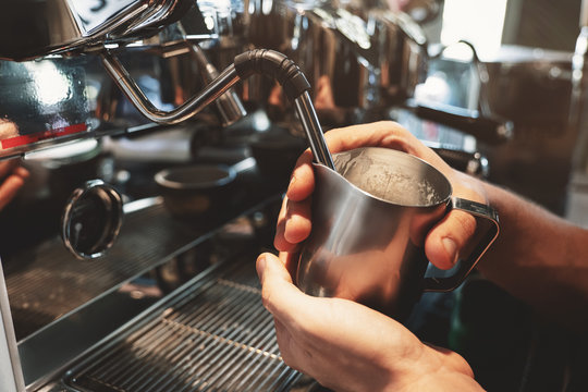 Close up of barista steaming milk for hot cappuccino. Preparation service concept