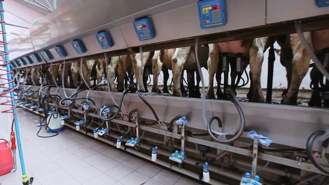 Milking cows by automatic industrial milking rotary system in modern diary farm
