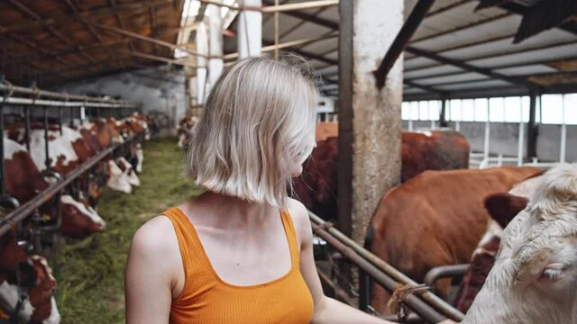 Young beautiful female worker in cowshed barn smiling looking at camera with excited happy face expression. Agricultural business, agronomy. Raising livestock. Farming concept. Sunny background.