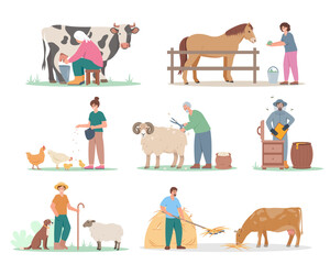 Set of farming people characters. Farmers workers, shepherd, beekeeper, milkmaid caring for livestock animals. Agricultural scenes isolated on white background. Vector illustration.