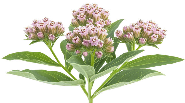 Purple milkweed cluster, vibrant green leaves, pale lavender flowers, botanical illustration, elegant composition Isolated on white background or PNG