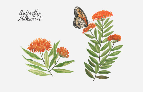 Hand watercolor drawing butterfly milkweed