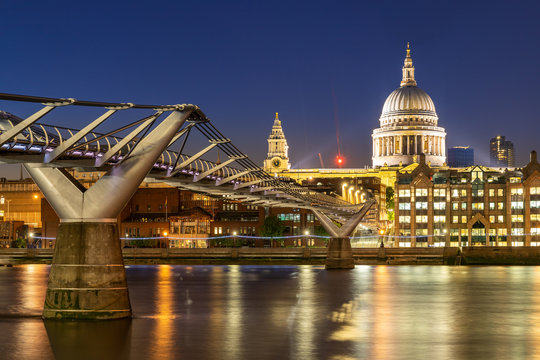 St. Paul's Cathedral and Millennium Bridge, officially known as the London Millennium Footbridge, across the river Thames