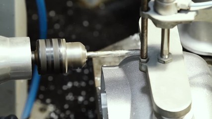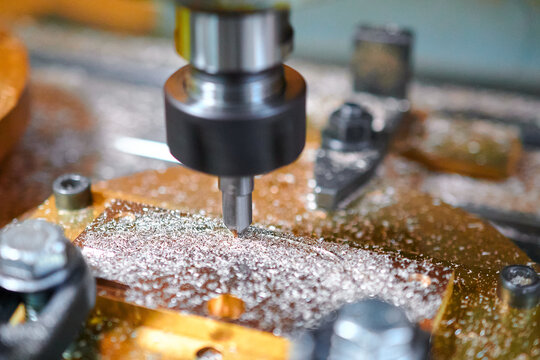 Advanced Metalworking CNC milling machine employing modern processing technology to cut metal, providing authentic shots in challenging conditions with some grain and potential blurriness due to a