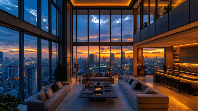 Elegant penthouse suite interior with panoramic sunset skyline view, modern minimalist living room and kitchen, floor to ceiling glass windows, luxury apartment dream millionaire lifestyle design