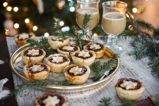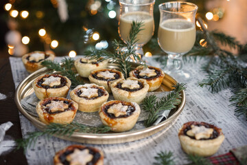 Warm cosy composition of traditional english festive pastry mince pies in wooden tray with blurred background of mulled wine drinks, lights garland and christmas tree on background. Close up.