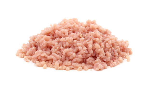 Chicken meatballs recipe. Step by step cooking meatballs in tomato sauce. Minced chicken in a bowl. Top view. Wooden background. Stir the minced meat
