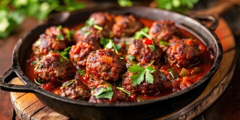 Slow cooked Tex Mex meatballs with eggplant and mincemeat in a spicy sauce served in a rustic cast iron roasting dish