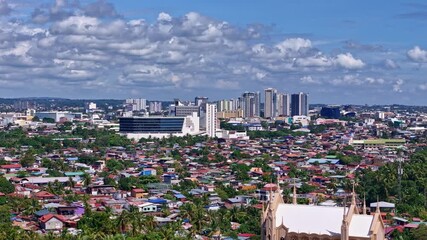 Aerial view Davao City Mindanao Philippines panning right to left showing downtown contrast of architecture.