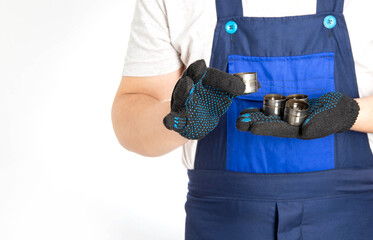 Auto mechanic minder holds in his hand automobile hydraulic lifters. Replacement of hydraulic lifters, malfunction of the lubrication system. Copy space for text